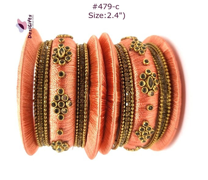 Peach Shade Threaded Bangles Set With Golden Work, BGL# 479