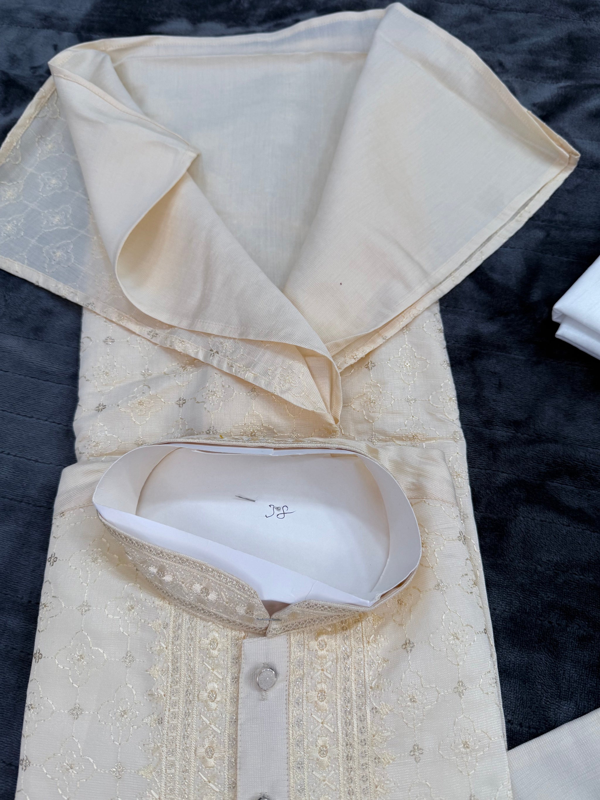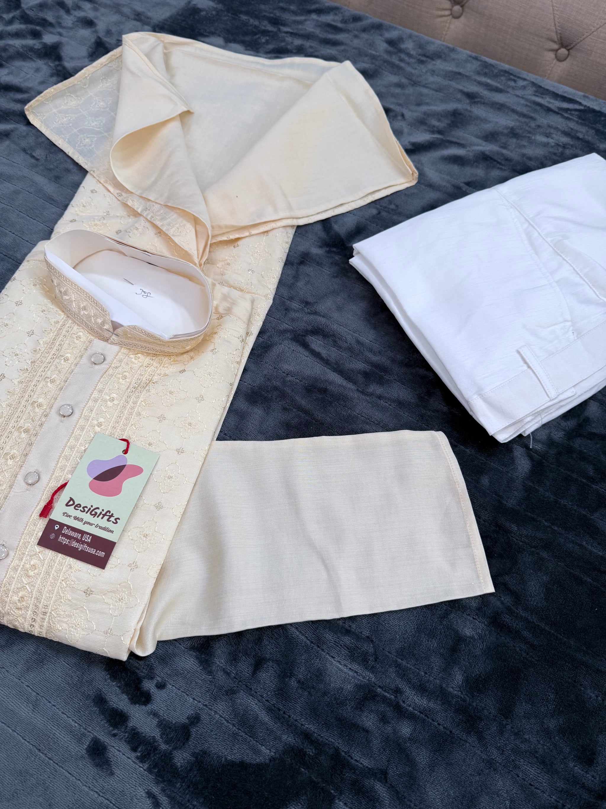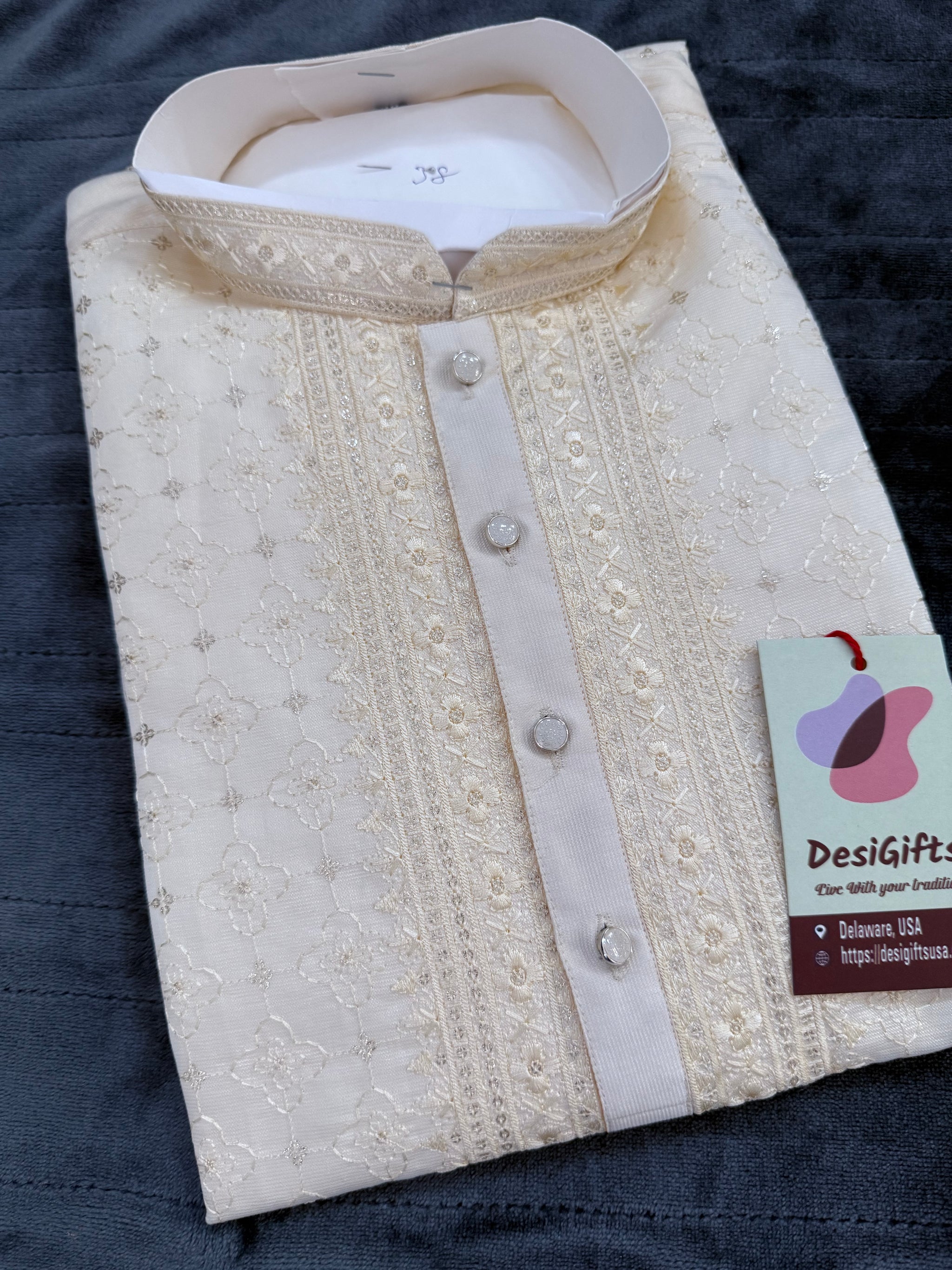 • Elegant 2-piece kurta pajama set crafted from Burberry cotton silk fabric Kurta with traditional neck and front embroidery. Ideal for formal occasions and festivals.