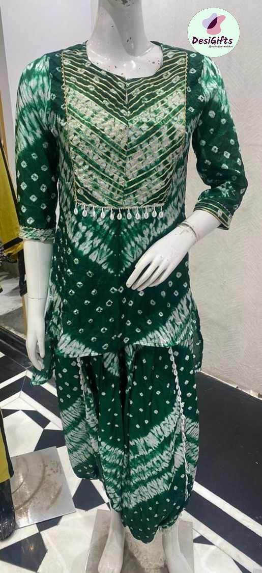 2 Piece Coord Set, Bandhej Tapeta Silk Kurti with Afgani Pant, Bandhej Girl Afgani Kurti with Handwork, Design WMN -1273