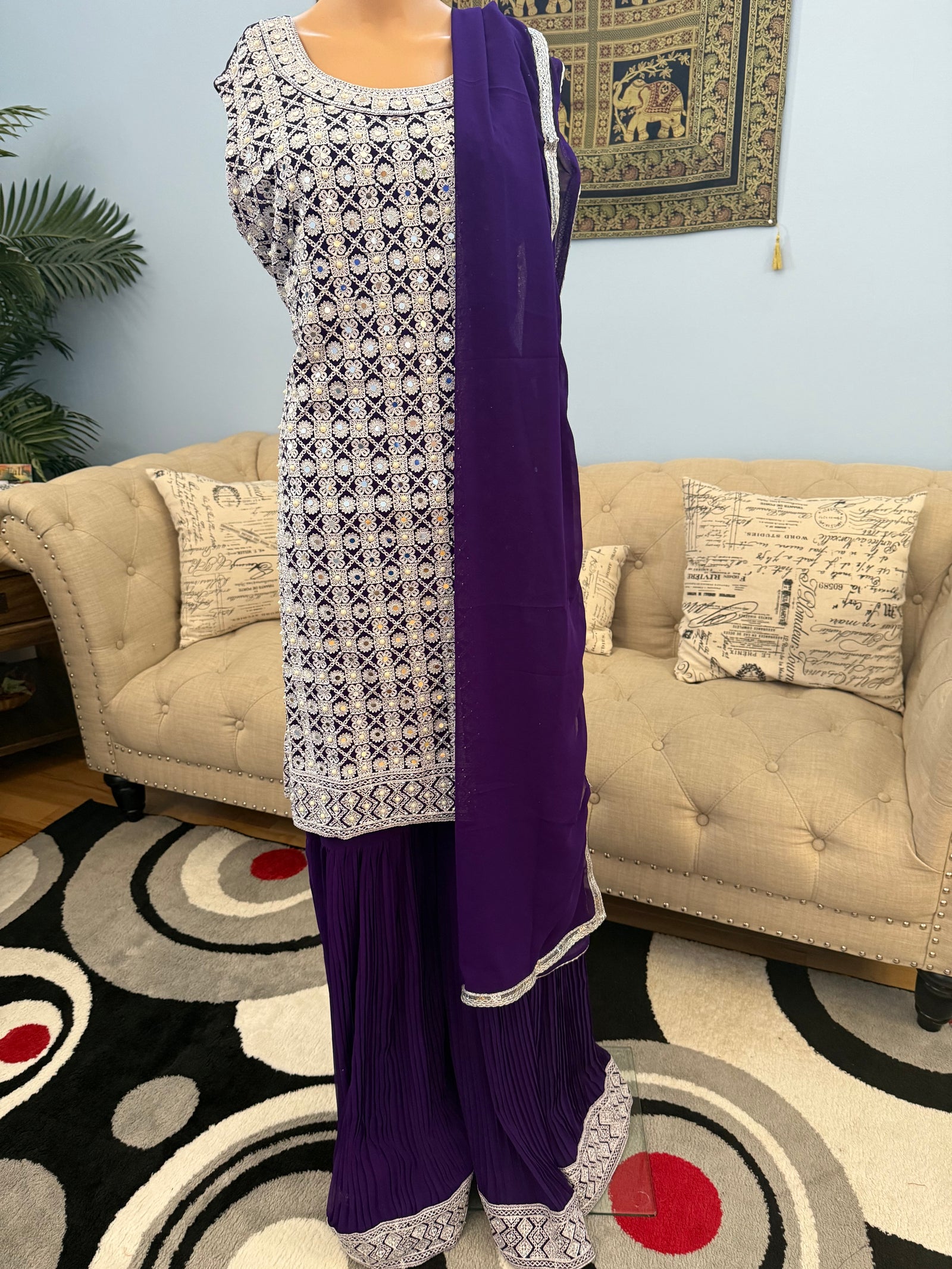 Georgette Palazzo Suit with Silver Thread Micro Mirror and Crystal Embellishments, Indian Ethnic Party Outfit, Design LHG - 1765