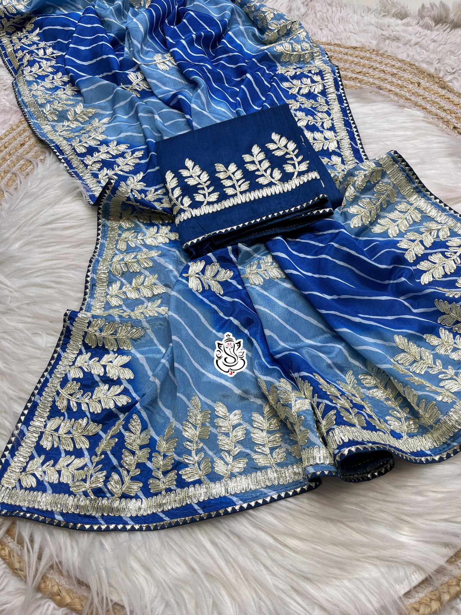 Soft Chinon Silk Lehriya Saree with Ribbon Gota Buti Work, Ready-Stitched Blouse, Fall & Pico, Elegant Designer Sari, S- 1866