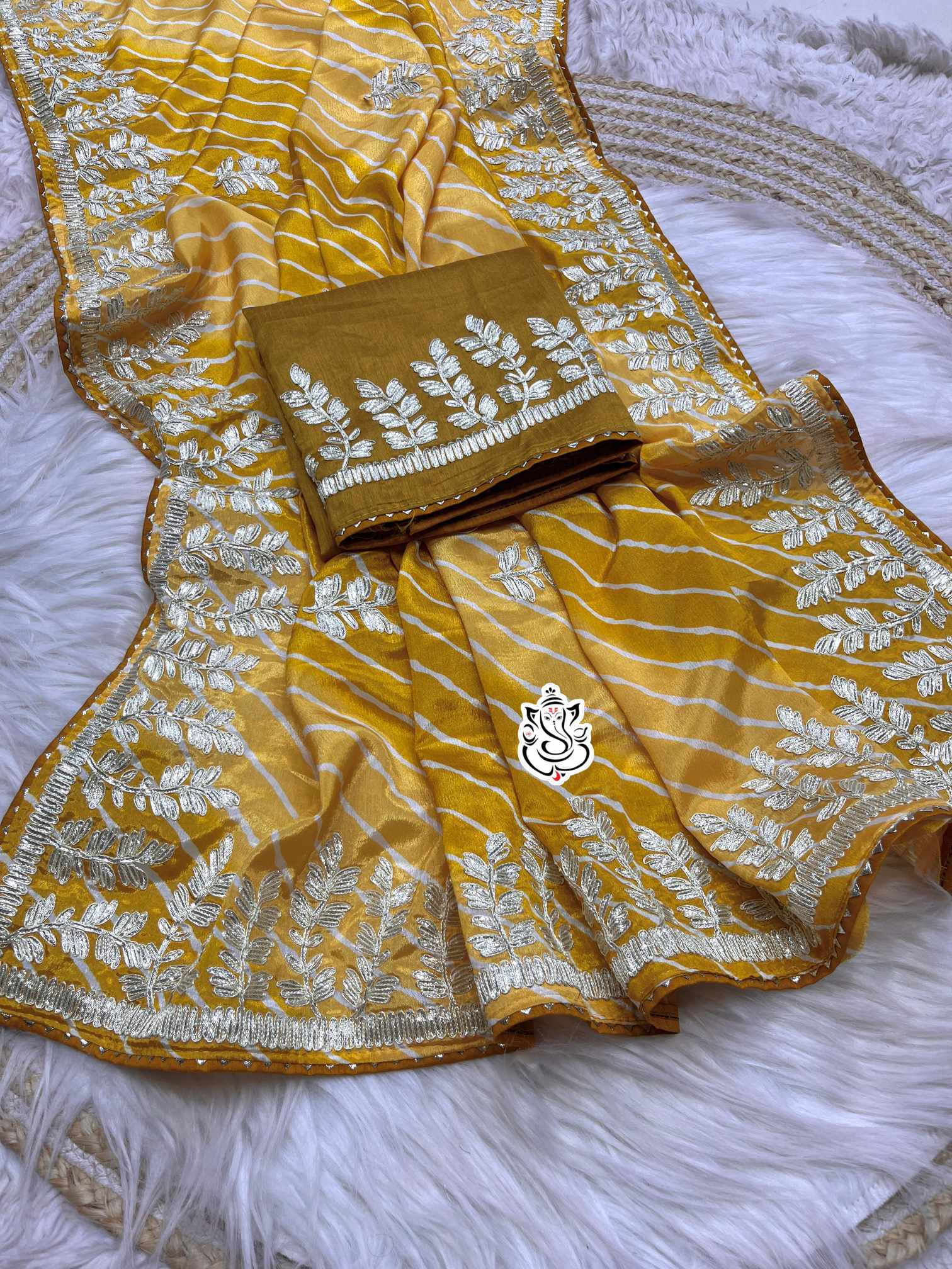 Soft Chinon Silk Lehriya Saree with Ribbon Gota Buti Work, Ready-Stitched Blouse, Fall & Pico, Elegant Designer Sari, S- 1866