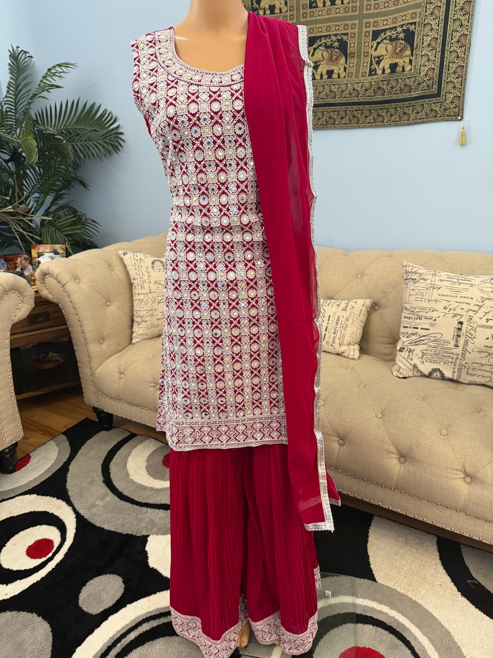 Full Length Gown in Red with Net on Belt Work, 3 Piece Set, Design GWN # 457