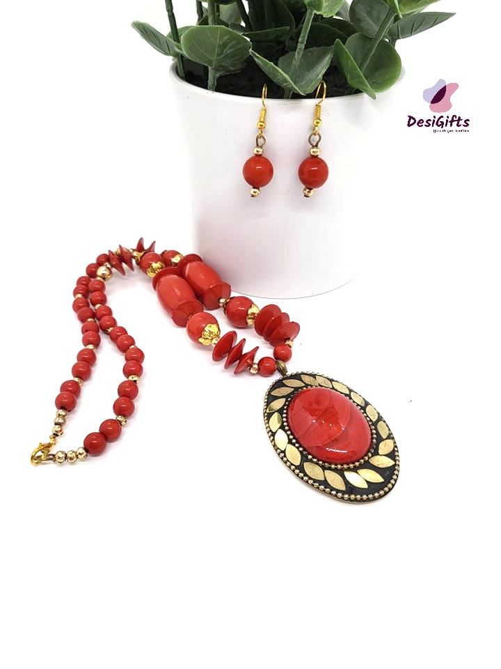 Apple Red Takkar Style Pendant With Pearls Necklace Set, NKT#334