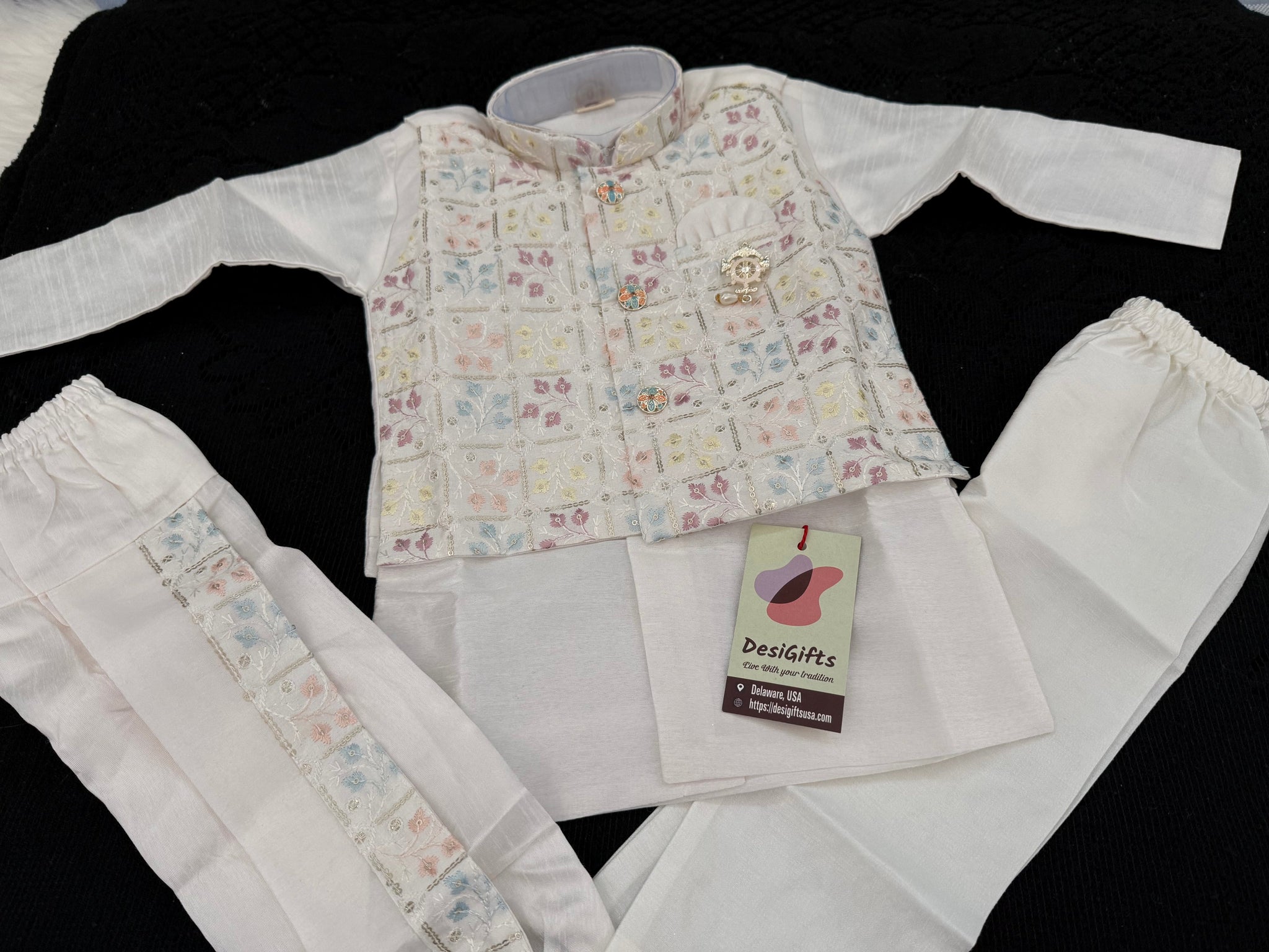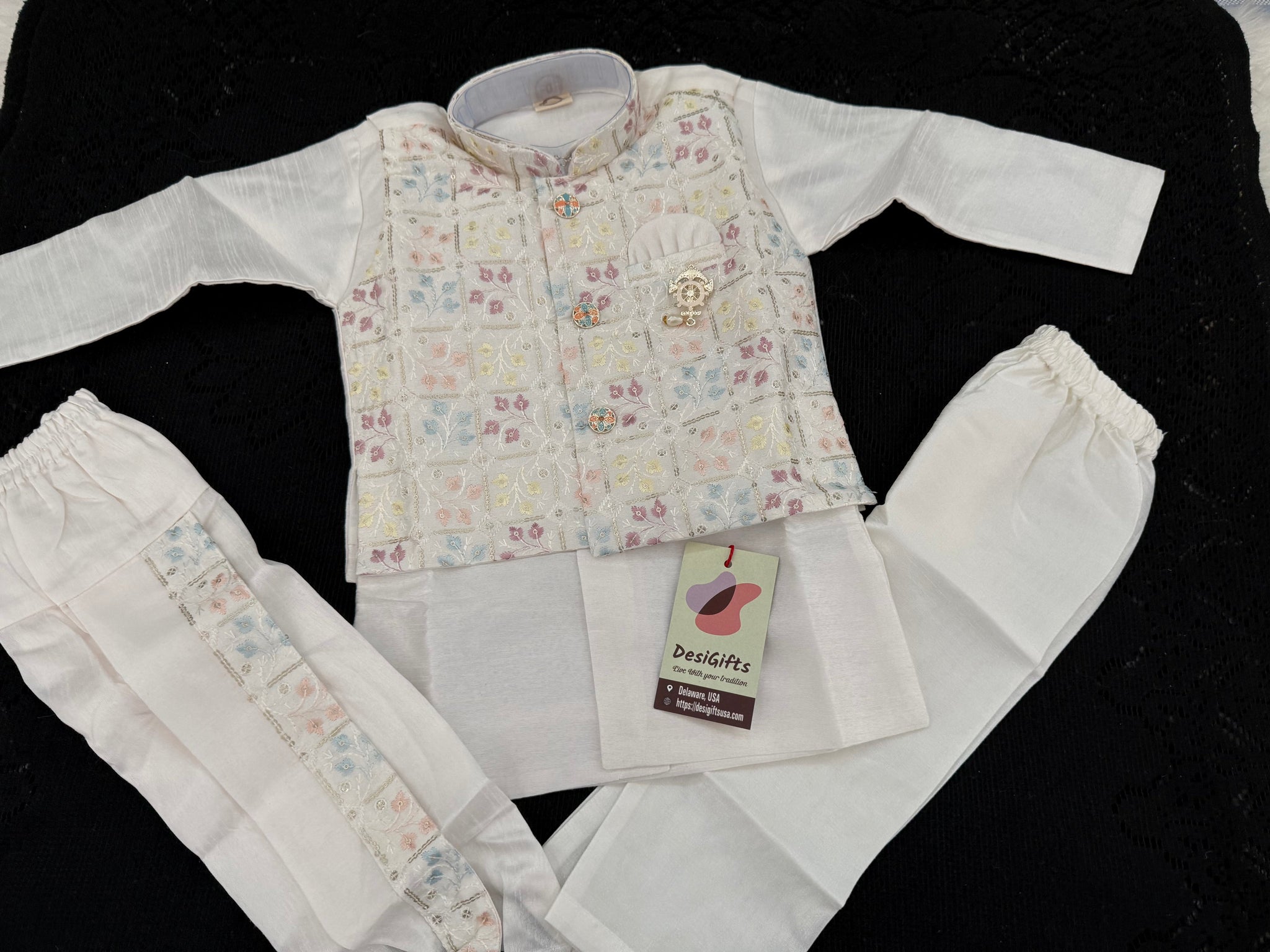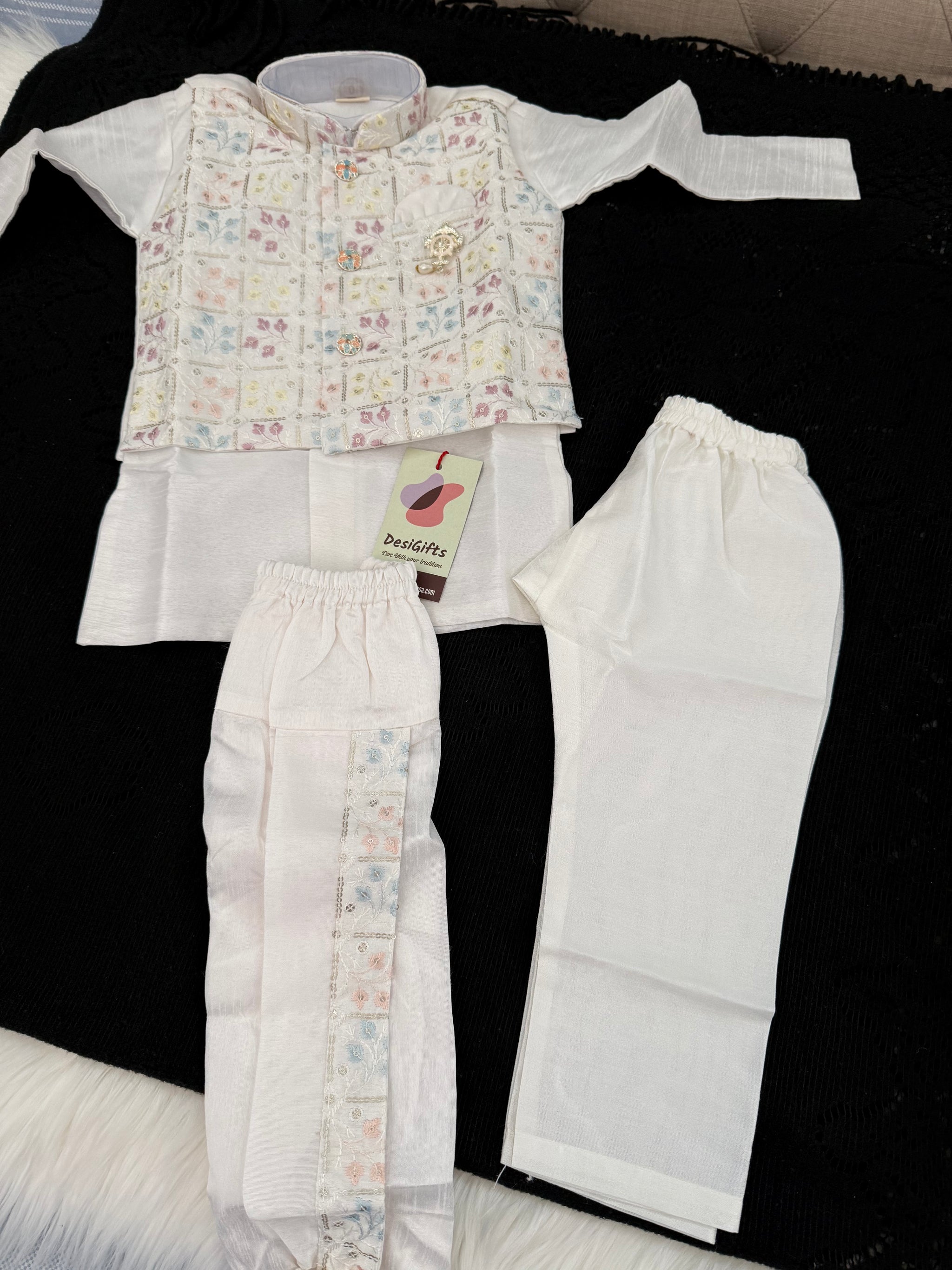 White shade 4 Piece Boy's Cotton Silk Indian Kurta Set featuring a kurta with jacket, dhoti, and pajama. Premium crafted ensemble perfect for special occasions and celebrations.