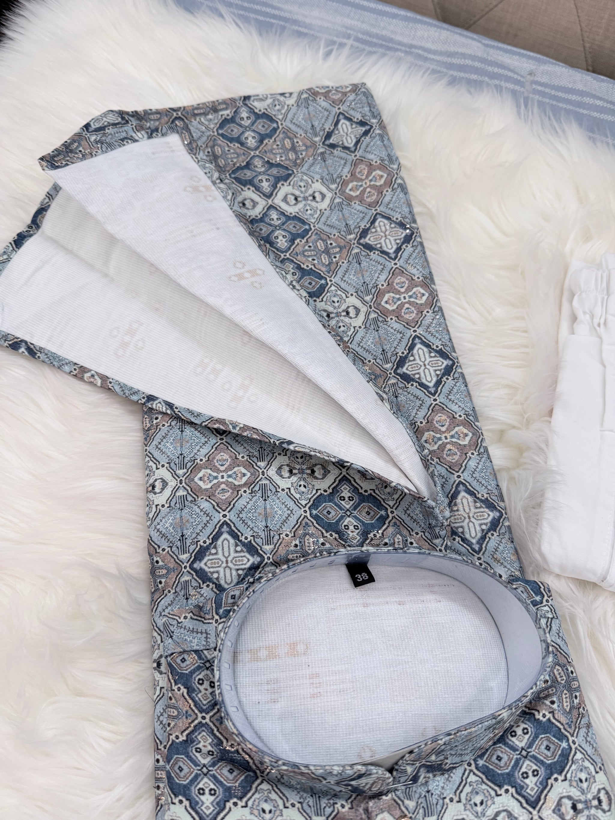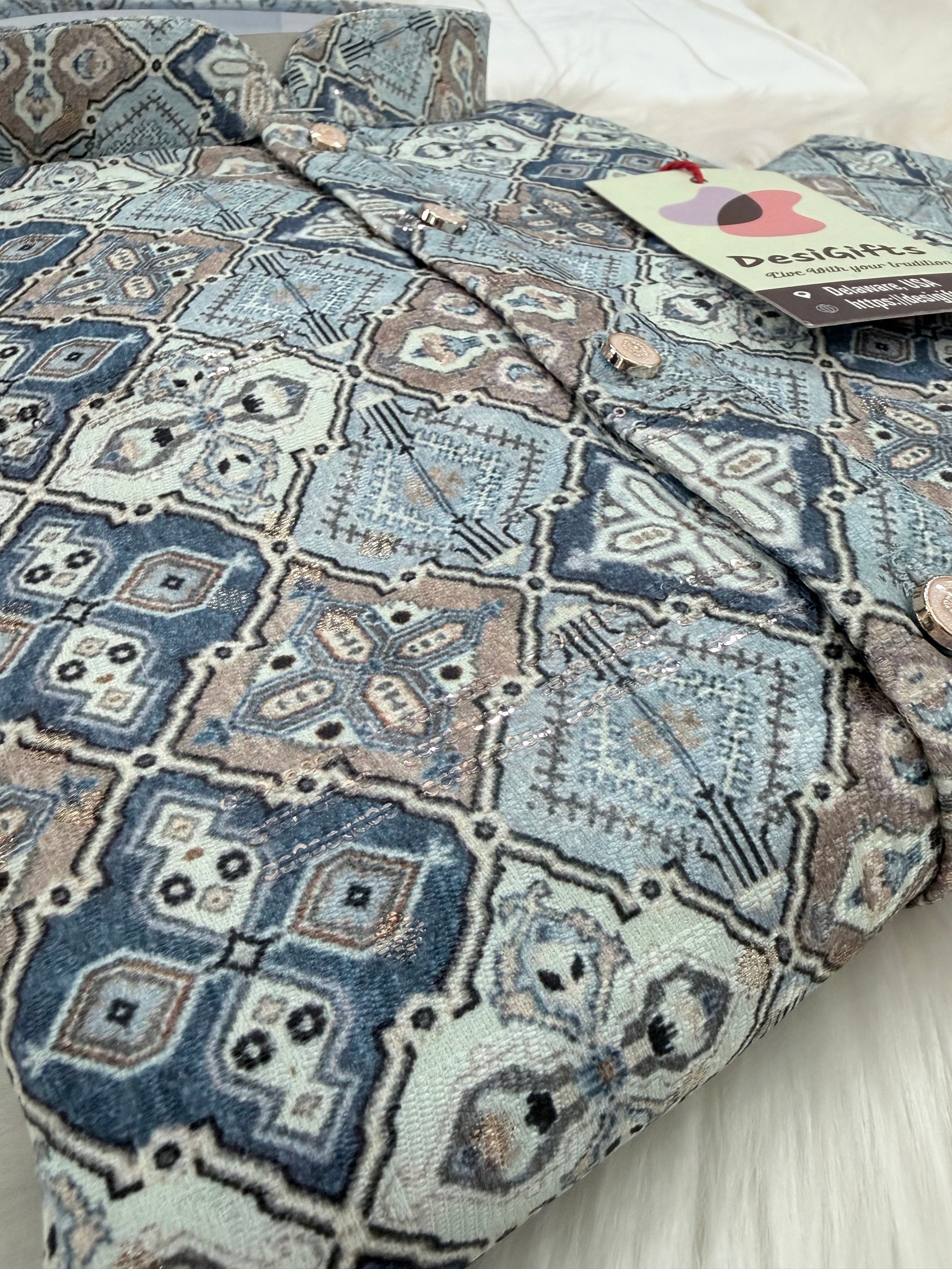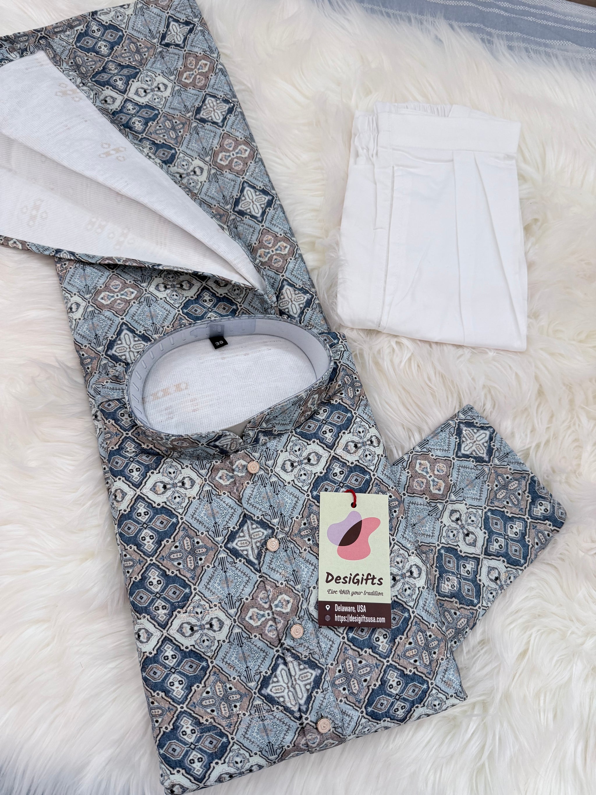 Colorful shade and intricate Embroidery pattern and sequins adorn this Kurta Pajama set, Made from premium quality mix cotton, it is perfect for the festive season.