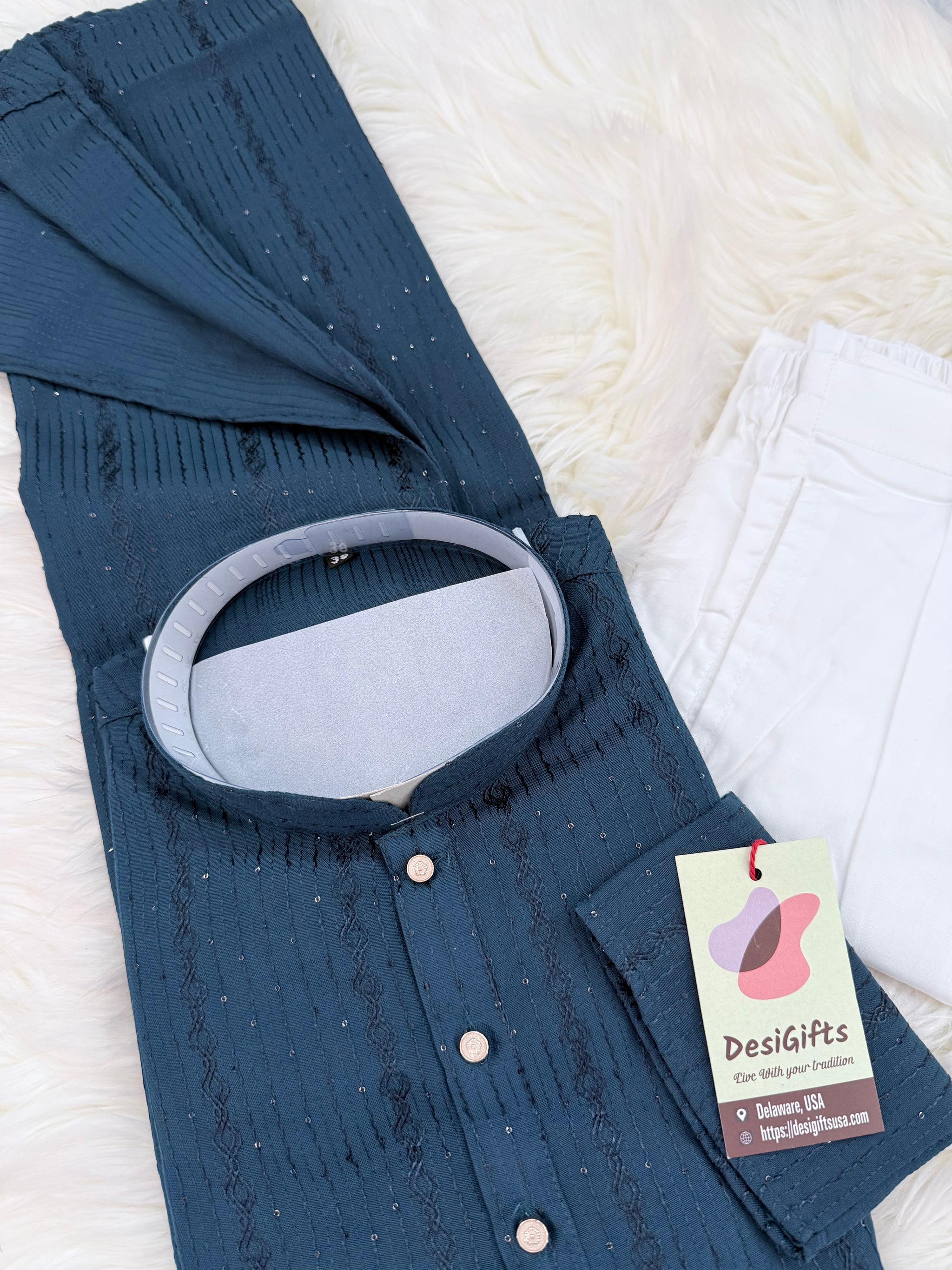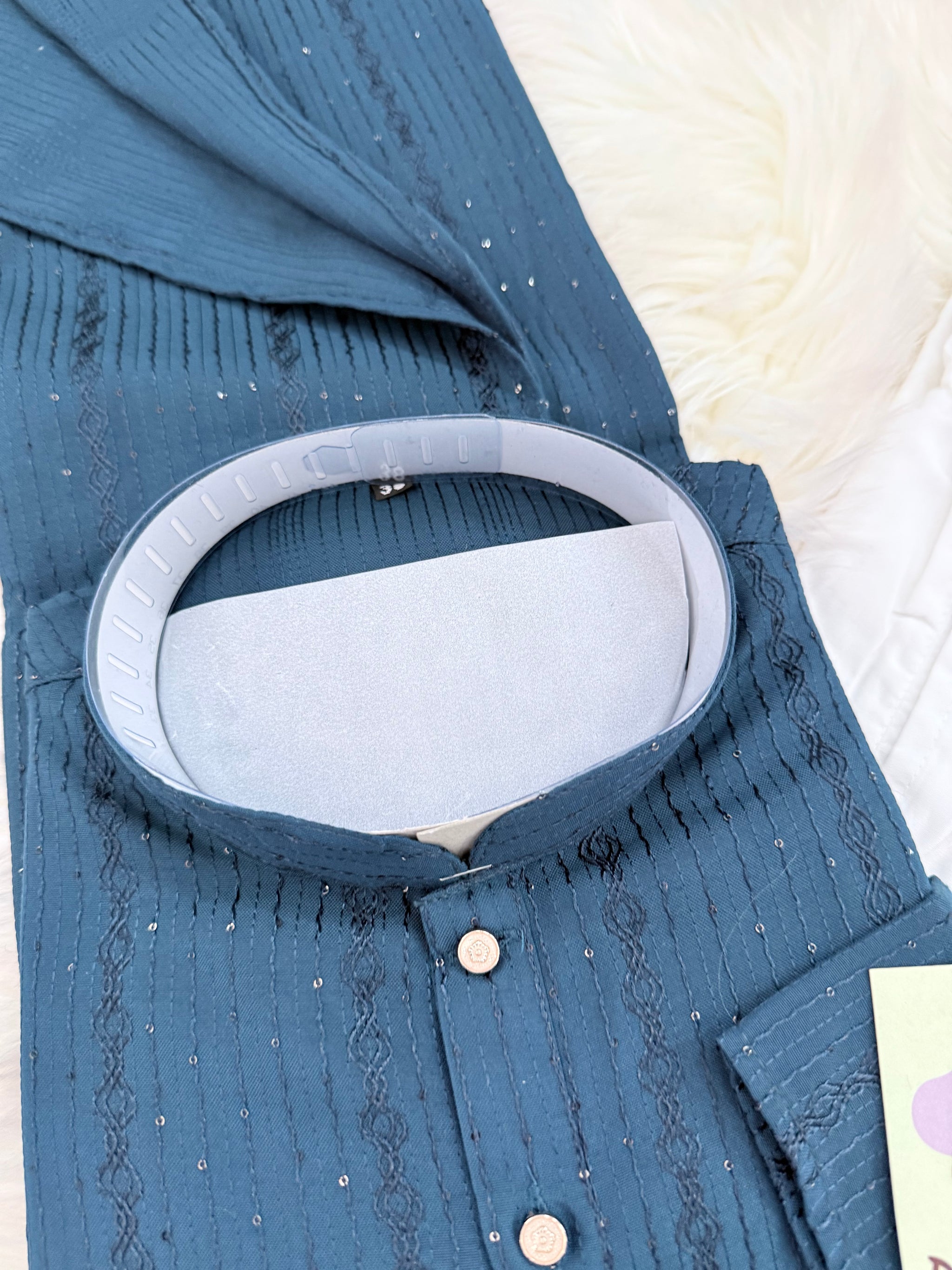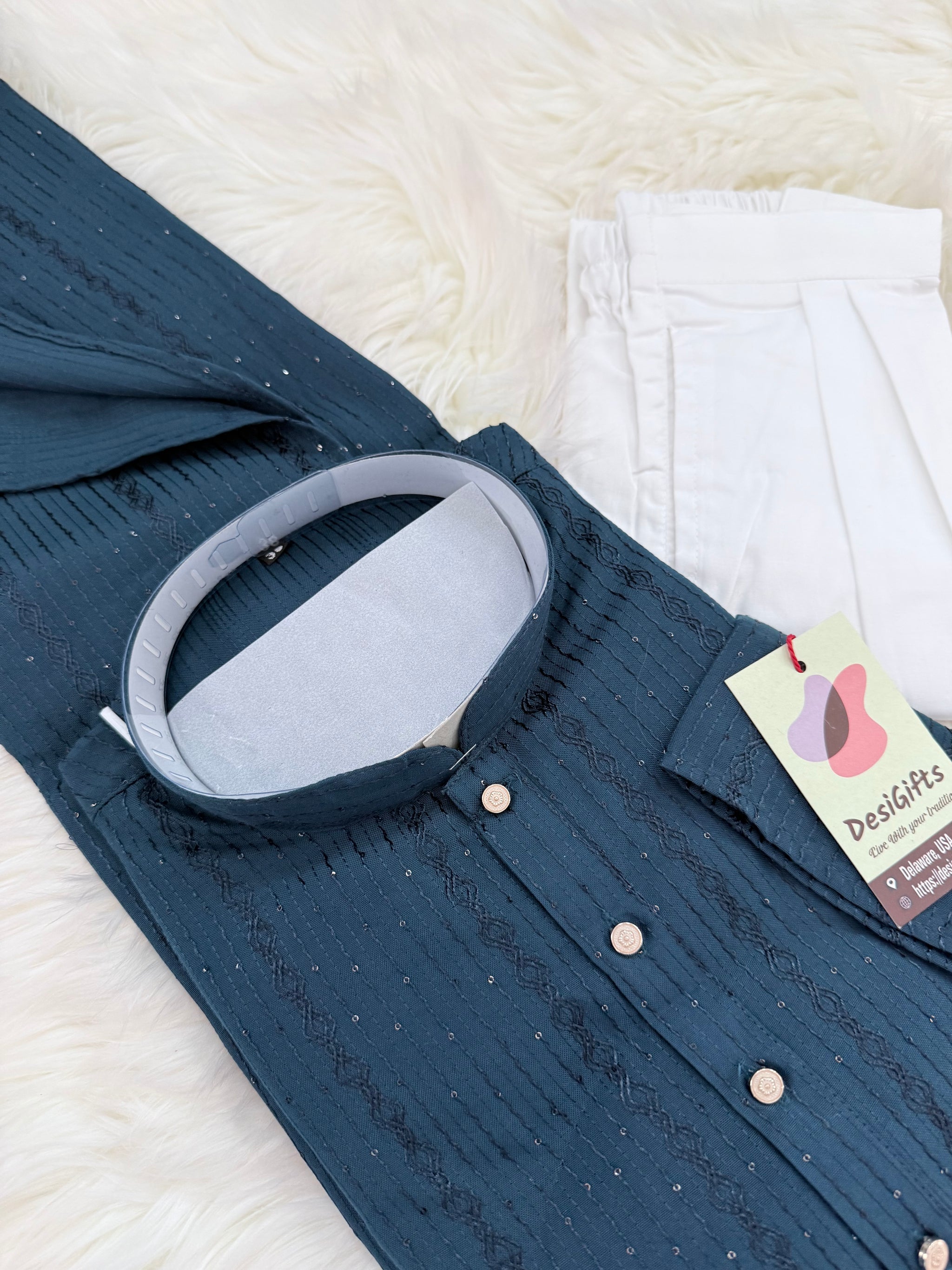 Men’s Teal Shade Sequins Embroidered Kurta Pajama Set – Indian Wedding & Partywear Traditional 2PC Outfit, Size 58 , 5XL, KP-2025