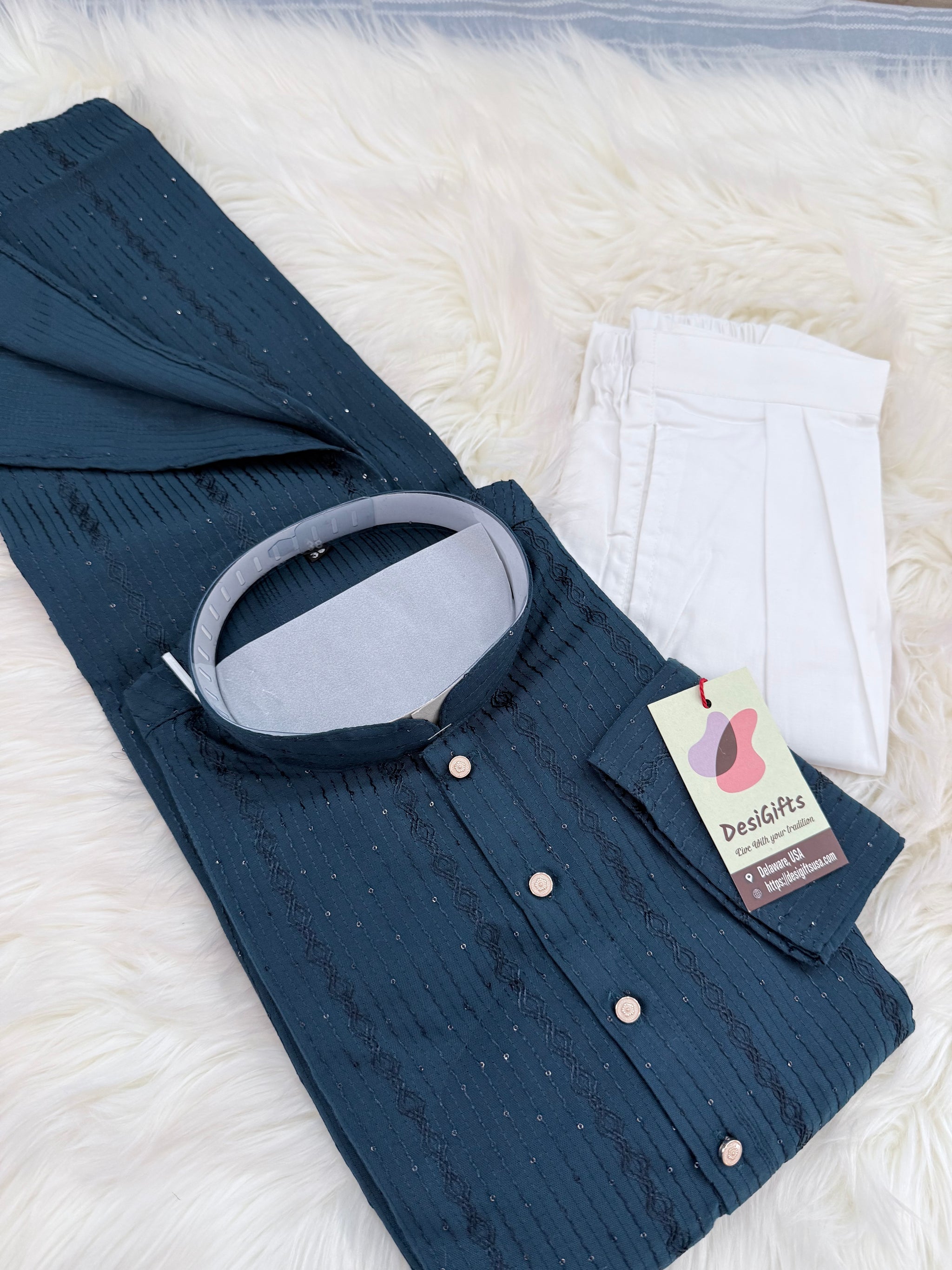 • Elegant men's kurta pajama (Trouser style) set crafted from premium viscose with intricate black sequins embroidery. This traditional two-piece ensemble is designed for weddings, celebrations, and formal Indian occasions, offering refined style and authentic craftsmanship.