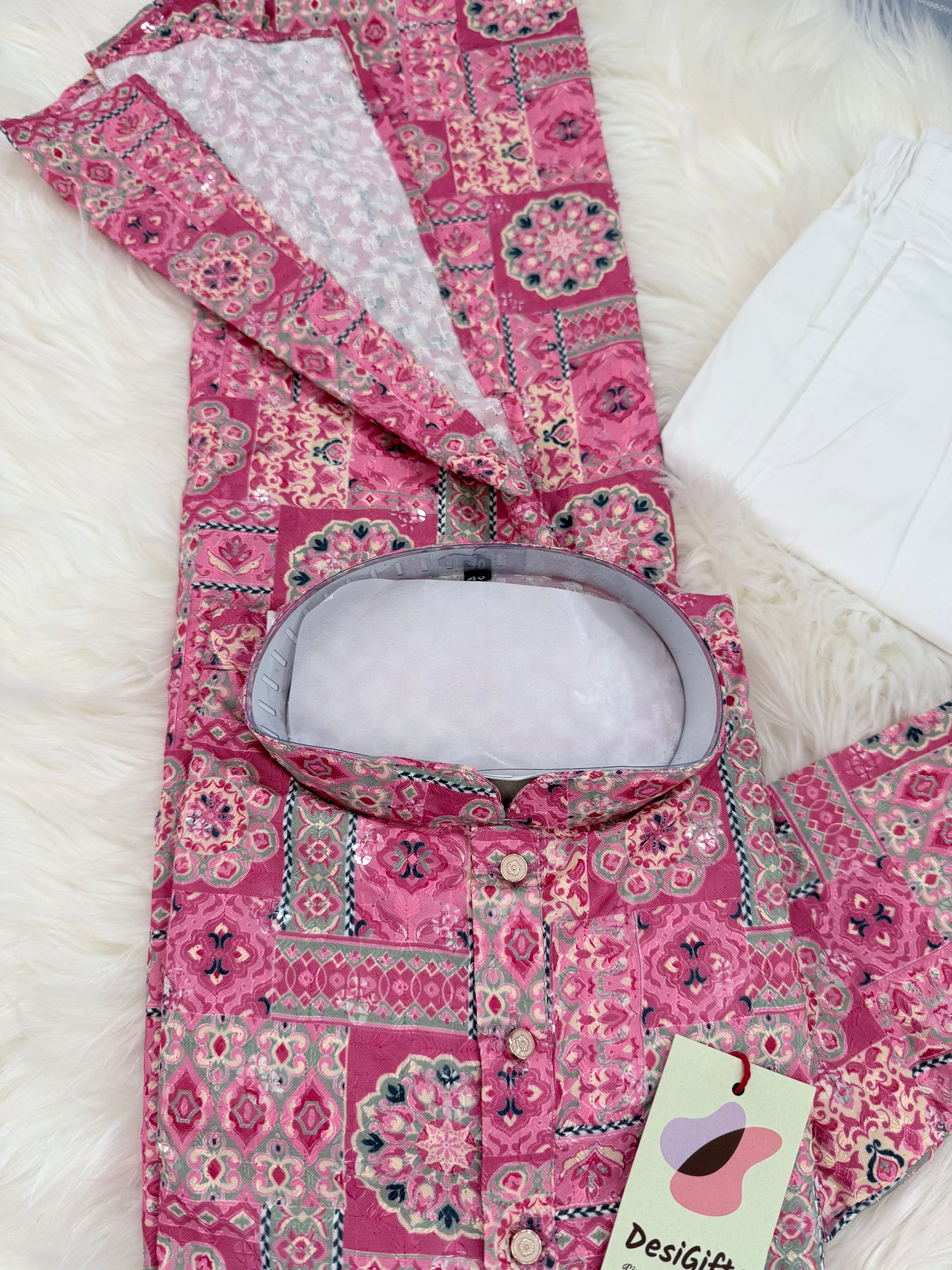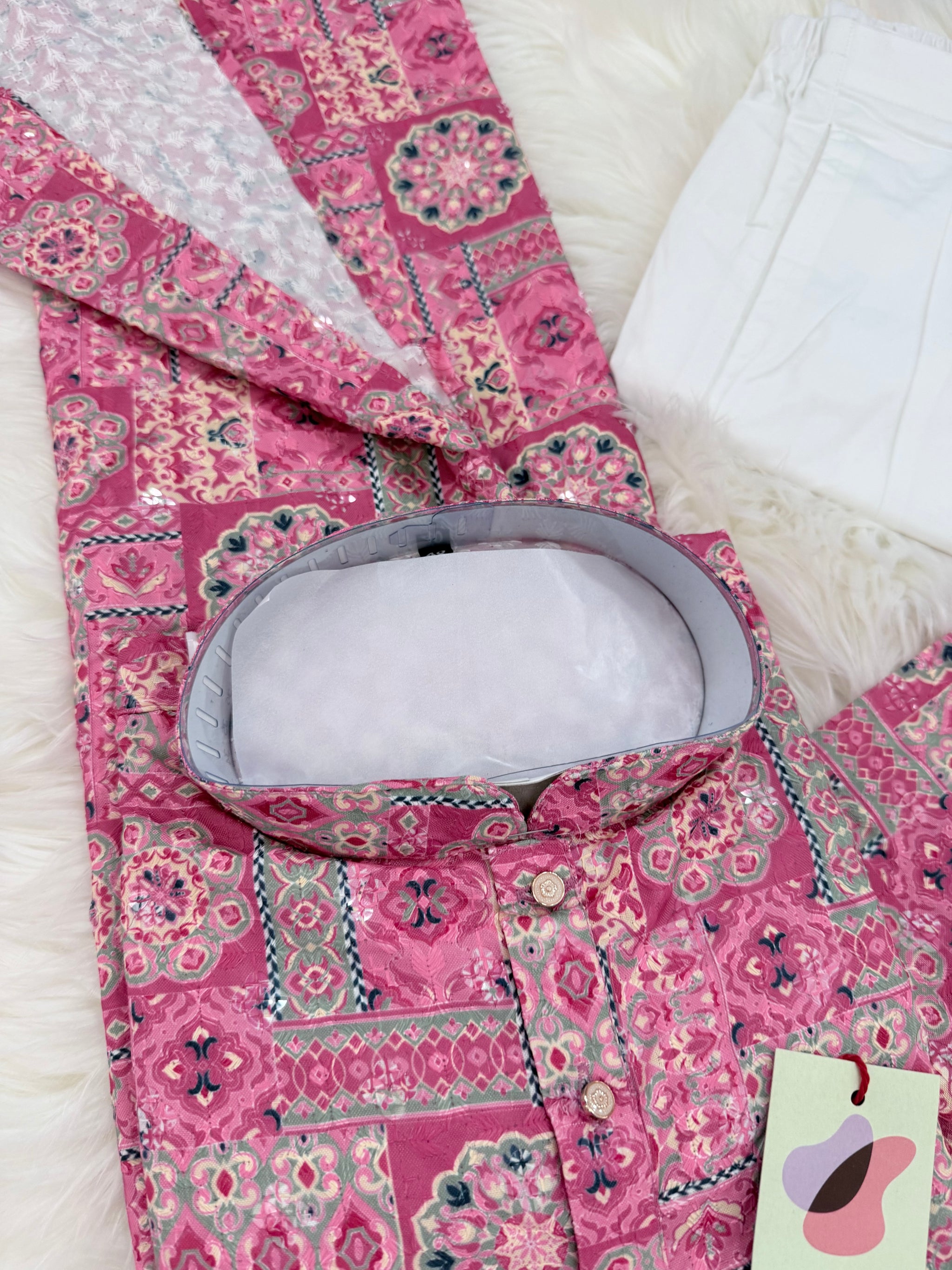 Elevate your festive wardrobe with this striking pink kurta pajama set (Trouser Style), featuring exquisite embroidered detailing and shimmering sequin accents. Crafted from luxurious viscose rayon, this traditional ensemble combines comfort with refined elegance, making it an ideal choice for celebrations and special occasions.