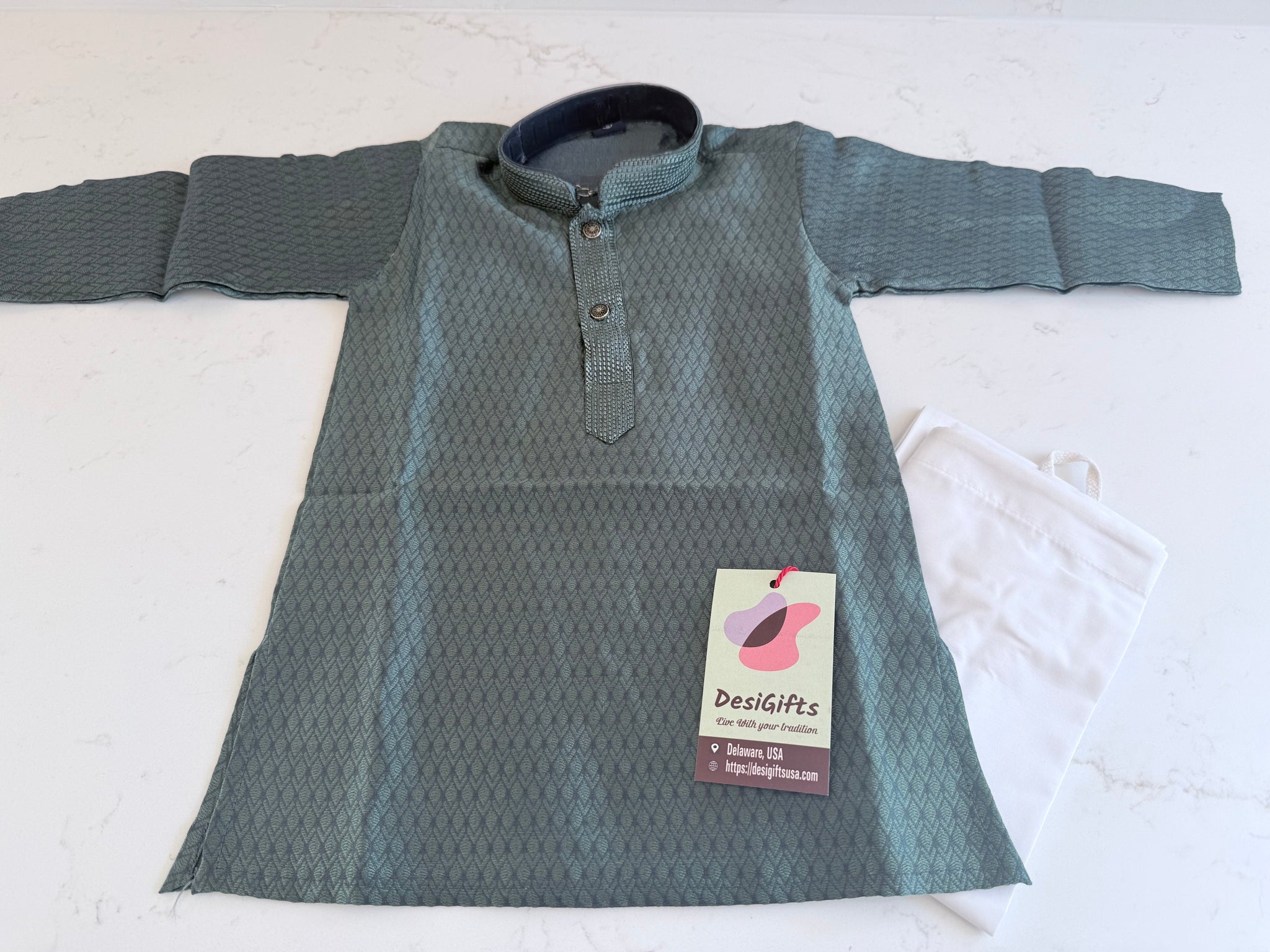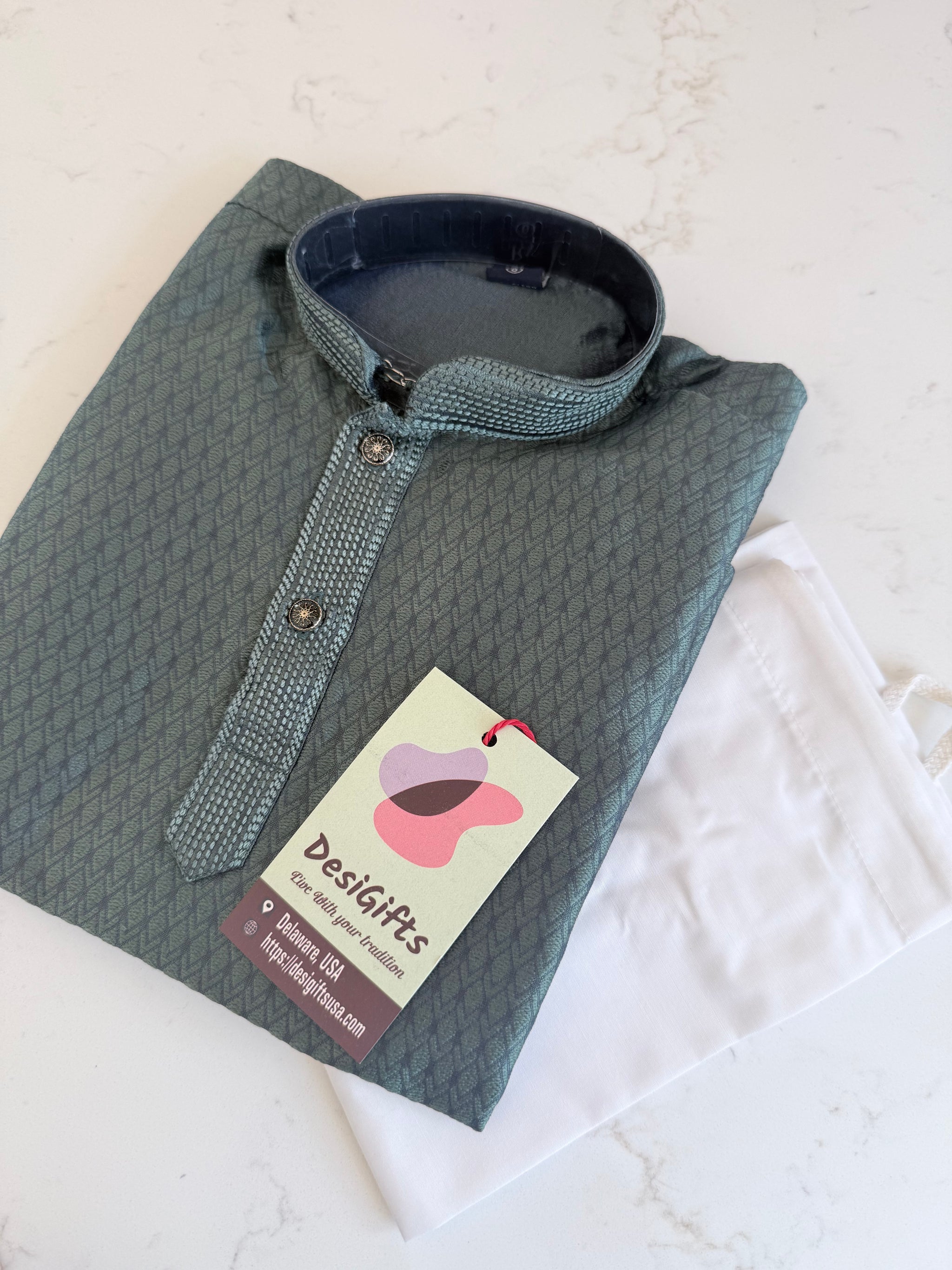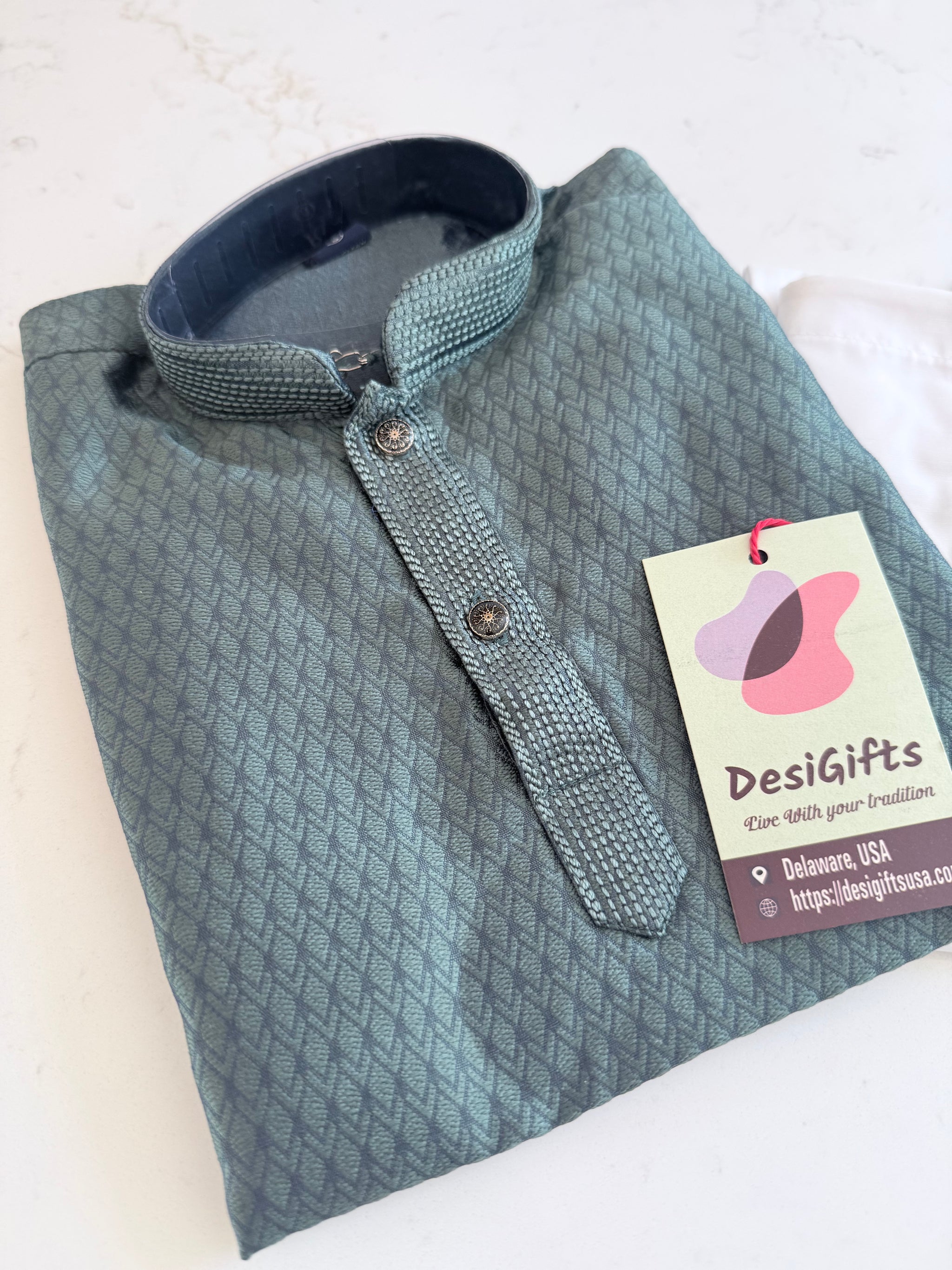 • Teal green cotton-silk kurta pajama with self design and decorative placket buttons. Durable fabric resists shrinking while maintaining vibrant color. Perfect for special occasions and celebrations.